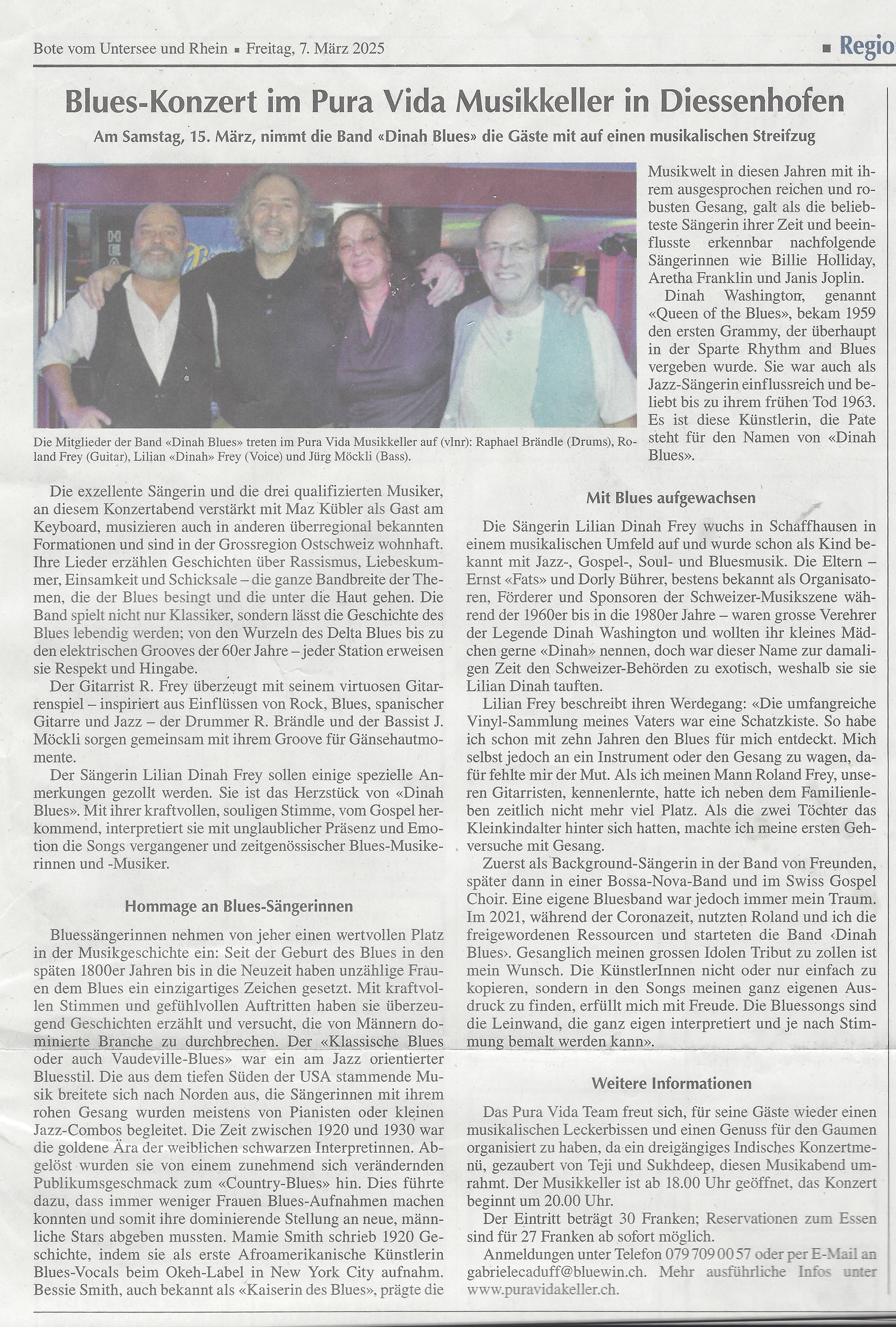 Groove, Emotionen und Songtexte - Musik, die unter die Haut geht – dafür steht Blues. Die vier Musiker aus dem Thurgau, welche nicht schon seit gestern in verschiedensten Formationen musizieren, berühren und fesseln das Publikum mit ihrem gefühlsvollen und mitreissenden Repertoire. Die Lieder erzählen Geschichten über Rassismus, Liebeskummer, Einsamkeit und Schicksale. Lilians "Dinah" starke Stimme, seelenvolle Gitarrensolos und der treibende Bass-Drum-Groove und einem Keyboarder, der mit flinken Fingern ganze Klangwelten heraufbeschwört – mal funky, mal soulig, mal groovig, immer voller Gefühl. Mit viel Liebe erweckt die Band beim Zuhörer Begeisterung und Emotionen und regt auch zum Nachdenken an. Lilian, Roland, Raphael, Maz und Jürg nehmen ihre Zuhörer mit auf einen Streifzug durch die verschiedenen musikalischen Genres und lassen ihr Publikum den Blues hautnah fühlen und erleben.